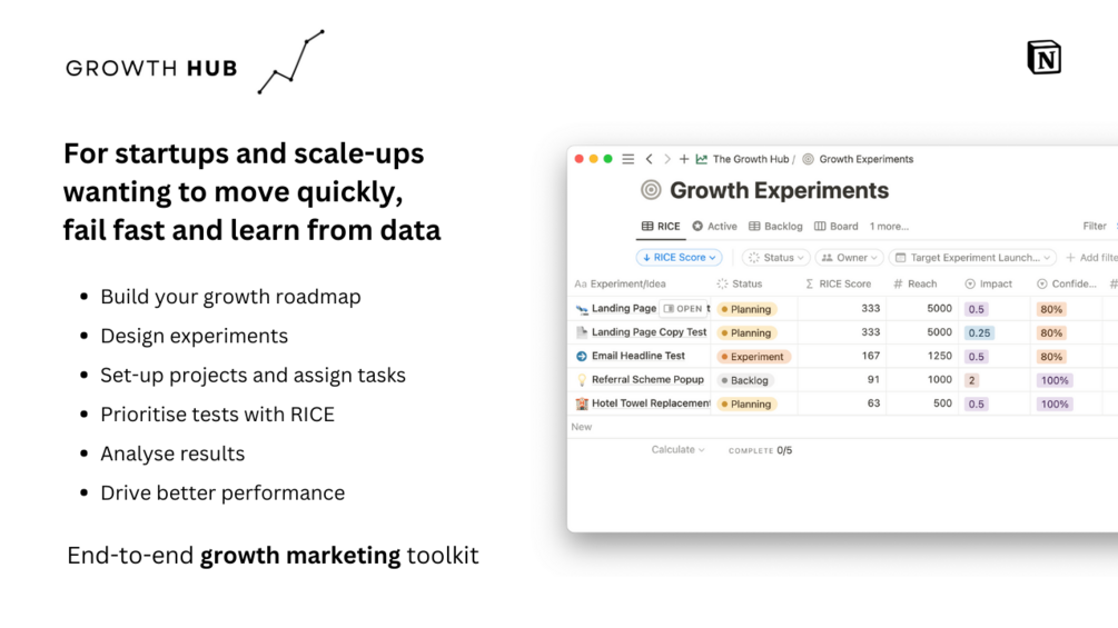 - Growth experiment management database with RICE prioritization and backlog